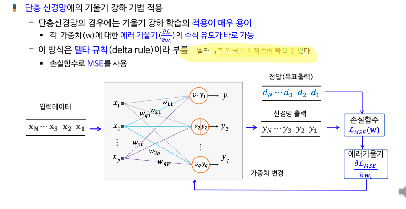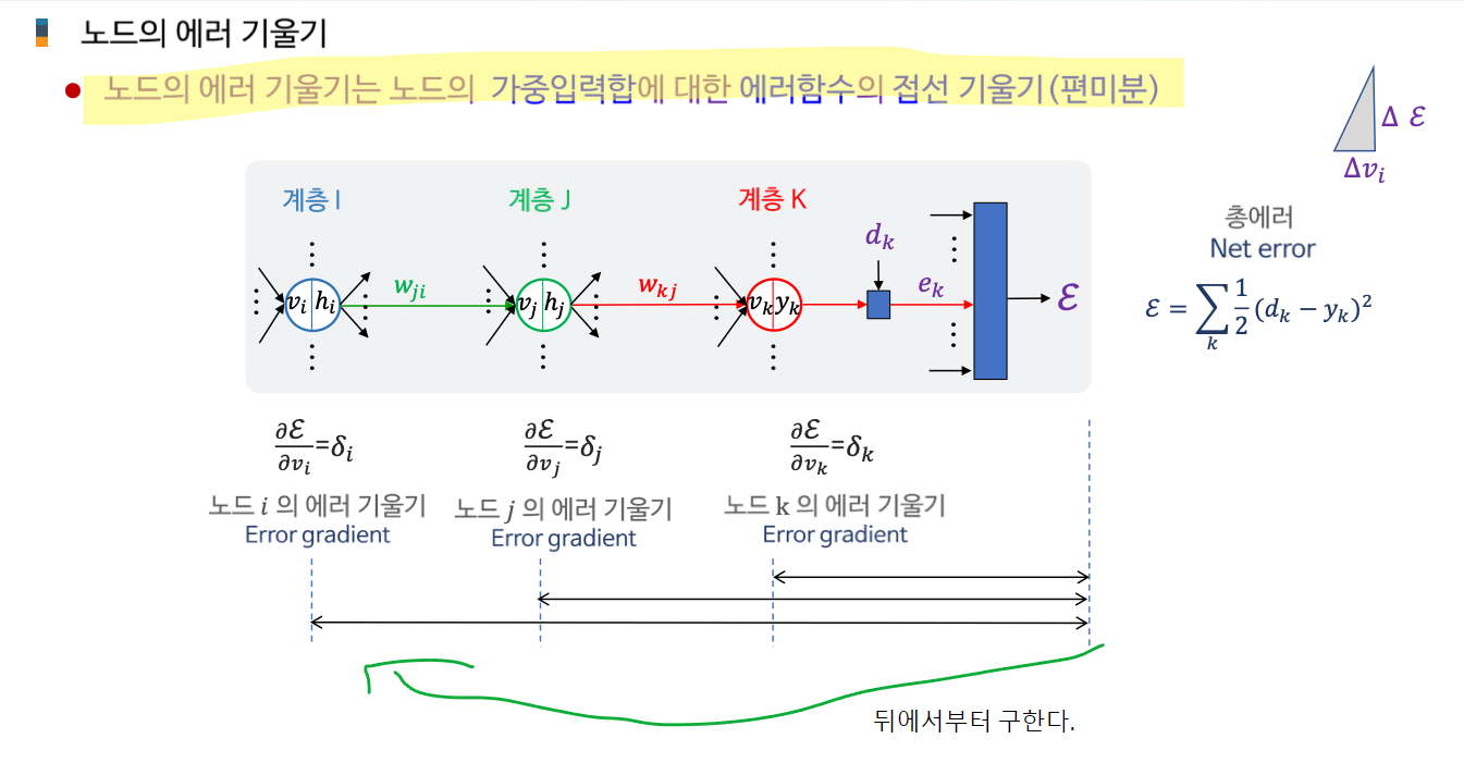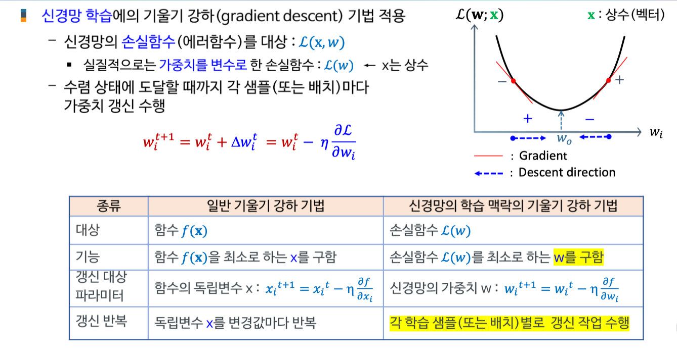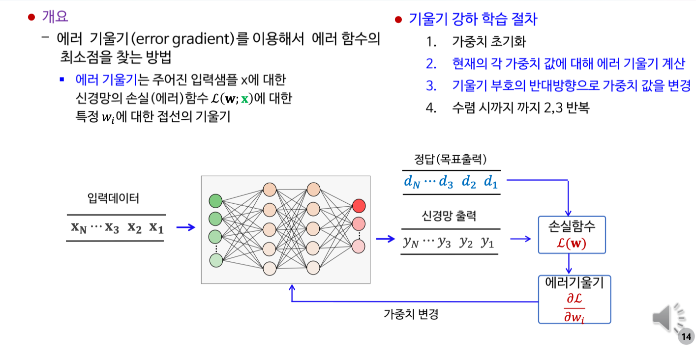 AI 인공지능/AI입문 [AI 입문] 신경망 학습 - 학습법 개관: 에러 정정 기법 손실함수 기울기 강하 기법 기울기 강하 기법의 신경망 학습 적용 개관 2. 단계층 신경망 학습: 델타 규칙 가중치에 대한 손실함수의 편미분 델타 규칙의 이해 3. 다계층 신경망 학습: 역전파 학습 알고리즘 역전파 학습 개념 합성함수의 미분 노드 에러 기울기 가중치 에러 기울기 오류 역전파 알고리즘 가중치 갱신 오류 역전파 알고리즘 공유하기 게시글 관리 KwanJoong DEV 'AI 인공지능 > AI입문' 카테고리의 다른 글 합성곱 신경망의 이해(Part2) (0) 2023.12.10 딥러닝과 CNN 이해 (Part1) (0) 2023.12.10 [AI 입문] 다층신경망(FNN)의 이해 (0) 2023.10.23 [AI 입문] 신경망 기초 (0) 2023.10.23 [AI 입문] 머신러닝(Machine Learning)의 이해 (0) 2023.10.23 Contents 당신이 좋아할만한 콘텐츠 합성곱 신경망의 이해(Part2) 2023.12.10 딥러닝과 CNN 이해 (Part1) 2023.12.10 [AI 입문] 다층신경망(FNN)의 이해 2023.10.23 [AI 입문] 신경망 기초 2023.10.23 댓글 0 + 이전 댓글 더보기