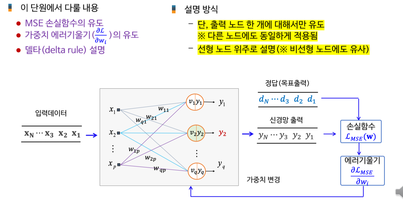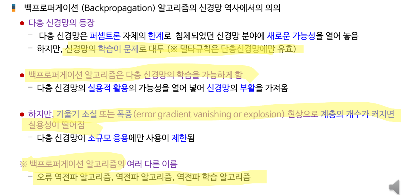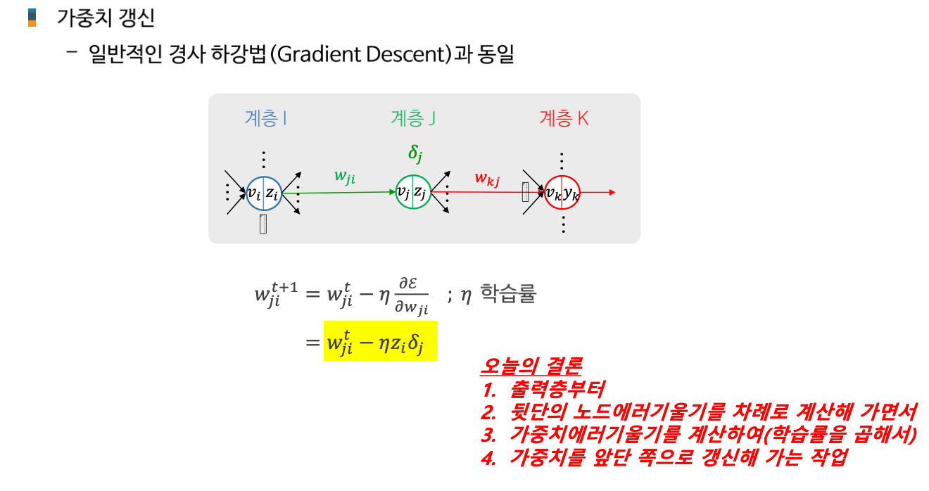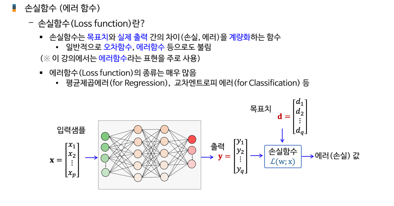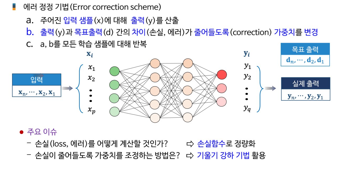 AI 인공지능/AI입문 [AI 입문] 신경망 학습 - 학습법 개관: 에러 정정 기법 손실함수 기울기 강하 기법 기울기 강하 기법의 신경망 학습 적용 개관 2. 단계층 신경망 학습: 델타 규칙 가중치에 대한 손실함수의 편미분 델타 규칙의 이해 3. 다계층 신경망 학습: 역전파 학습 알고리즘 역전파 학습 개념 합성함수의 미분 노드 에러 기울기 가중치 에러 기울기 오류 역전파 알고리즘 가중치 갱신 오류 역전파 알고리즘 공유하기 게시글 관리 KwanJoong DEV 'AI 인공지능 > AI입문' 카테고리의 다른 글 합성곱 신경망의 이해(Part2) (0) 2023.12.10 딥러닝과 CNN 이해 (Part1) (0) 2023.12.10 [AI 입문] 다층신경망(FNN)의 이해 (0) 2023.10.23 [AI 입문] 신경망 기초 (0) 2023.10.23 [AI 입문] 머신러닝(Machine Learning)의 이해 (0) 2023.10.23 Contents 당신이 좋아할만한 콘텐츠 합성곱 신경망의 이해(Part2) 2023.12.10 딥러닝과 CNN 이해 (Part1) 2023.12.10 [AI 입문] 다층신경망(FNN)의 이해 2023.10.23 [AI 입문] 신경망 기초 2023.10.23 댓글 0 + 이전 댓글 더보기